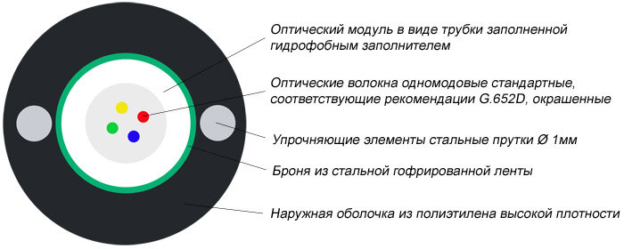 В кабеле используется стандартное одномодовое волокно с легированной германием